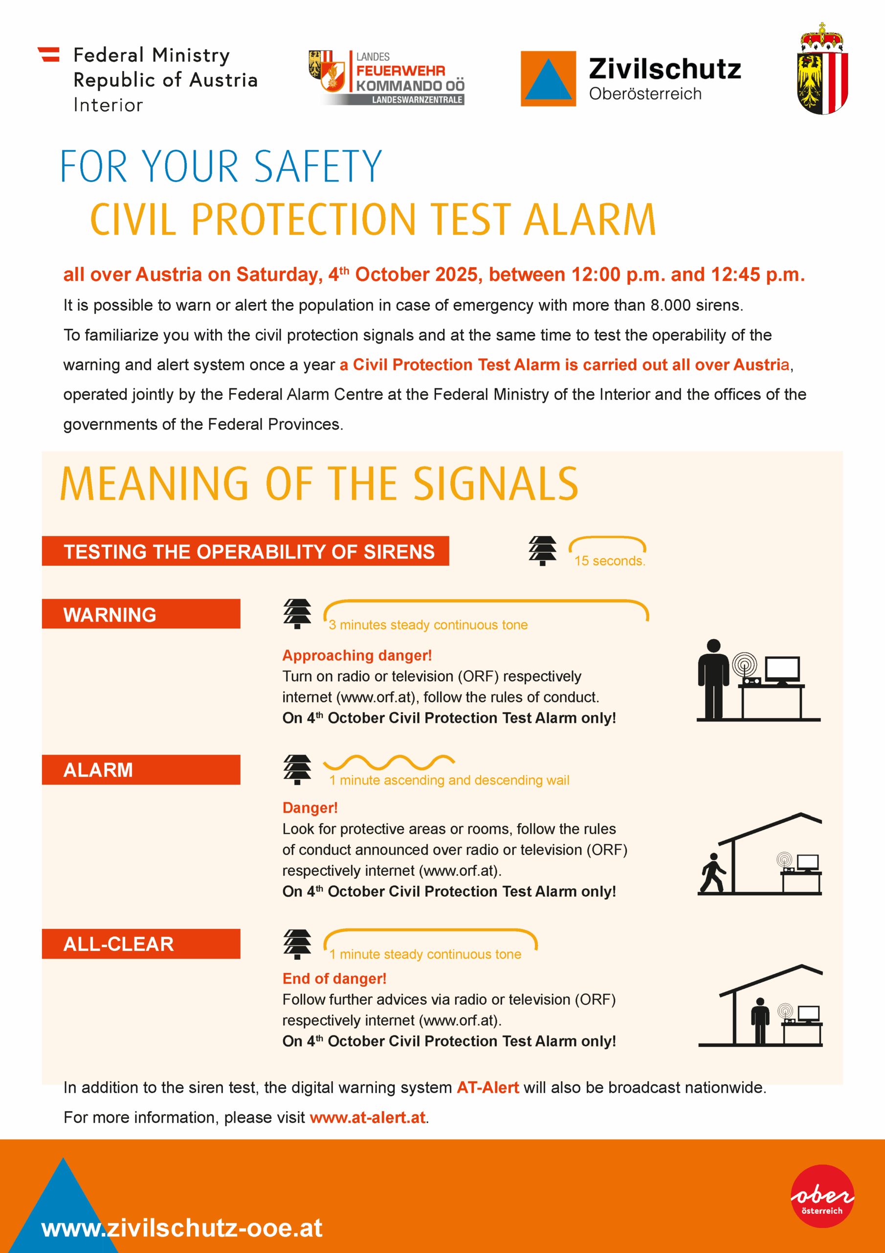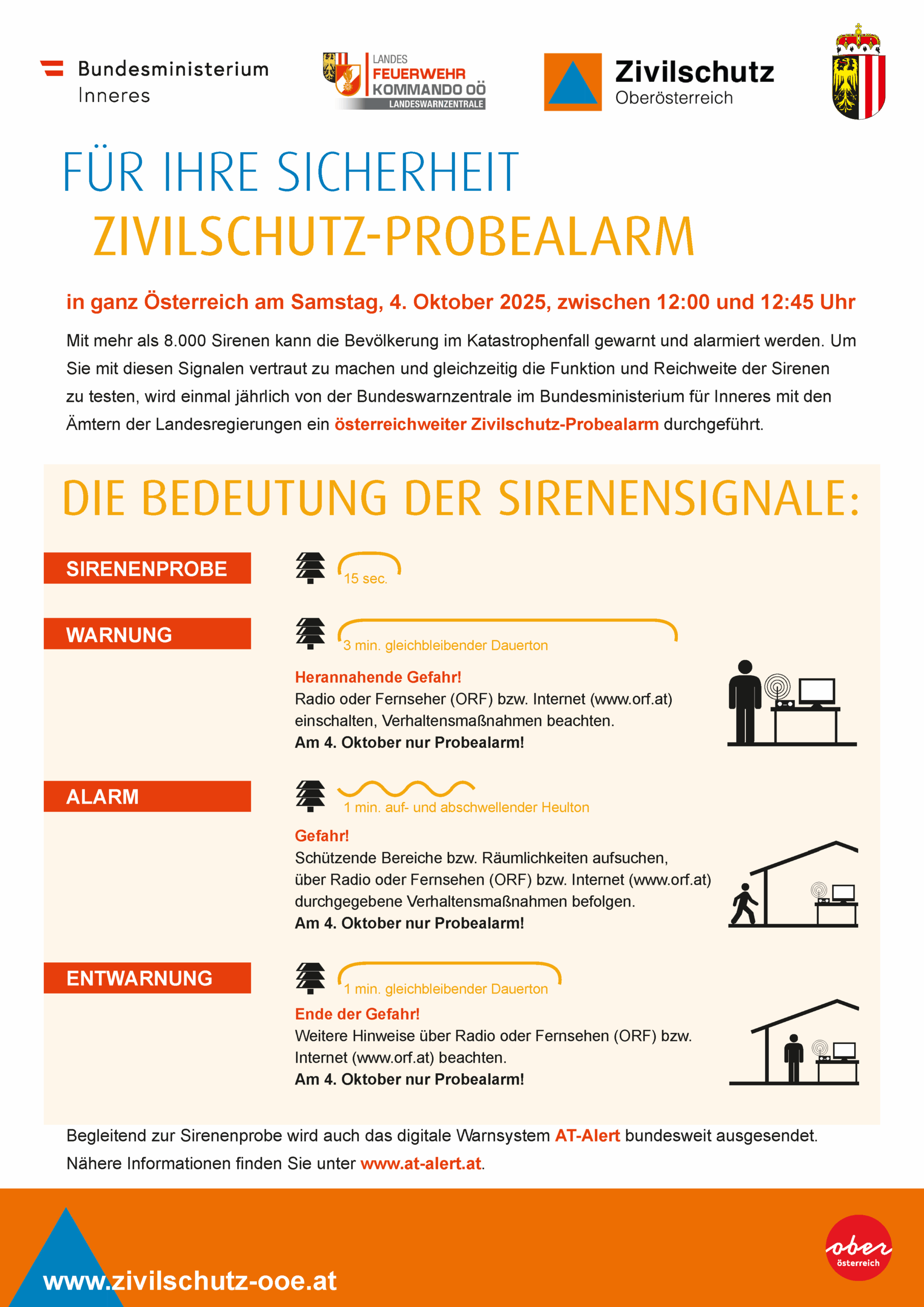 Nicht vergessen! Samstag, den 04.10.2025, findet zwischen 12:00 und 12:45 Uhr der jährliche Zivilschutz-Probealarm statt. Zu diesem Zweck heulen alle Sirenen mehrmals auf. Auch AT-Alert, das Bevölkerungswarnsystem, wird ausgelöst, das wichtige Informationen per SMS direkt auf Ihr Mobiltelefone sendet.